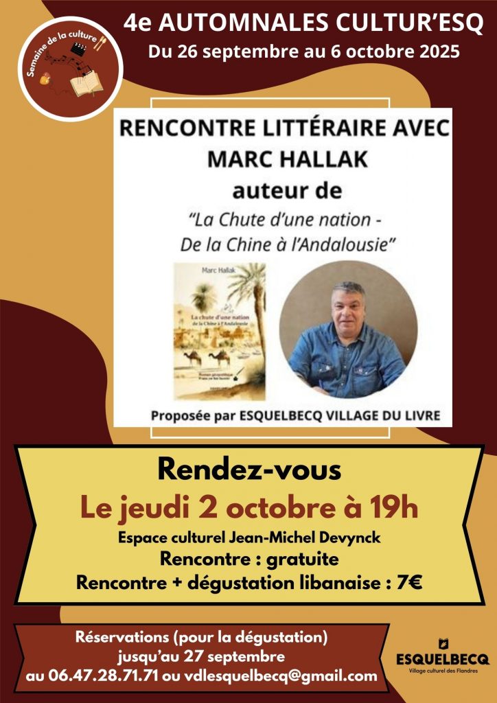 Nous recevrons M. Marc HALLAK, avec son roman géopolitique « La chute d’une nation – de la Chine à l’Andalousie ». Ce livre est une ode à la souffrance endurée par le Liban, un cri douloureux qui résonne dans le coeur de tous les patriotes. Il raconte l’histoire d’un peuple témoin de l’oppression et de la domination étrangère à travers les âges, mais dont la résilience et la force demeurent intactes. M. HALLAK a écrit ce livre, fruit d’une souffrance profonde et d’un désespoir qui envahissent nos terres, cri d’un coeur patriote. Il voit avec amertume la civilisation décliner, glissant lentement dans les abîmes de la cupidité, où tout est marchandé sans valeur, où l’étude est remplacée par l’appât du gain. Cette douleur étreint profondément l’auteur, fier et reconnaissant, revendiquant sa double appartenance franco-libanaise, un lien entre deux nations qui ont marqué son identité de manière indélébile.